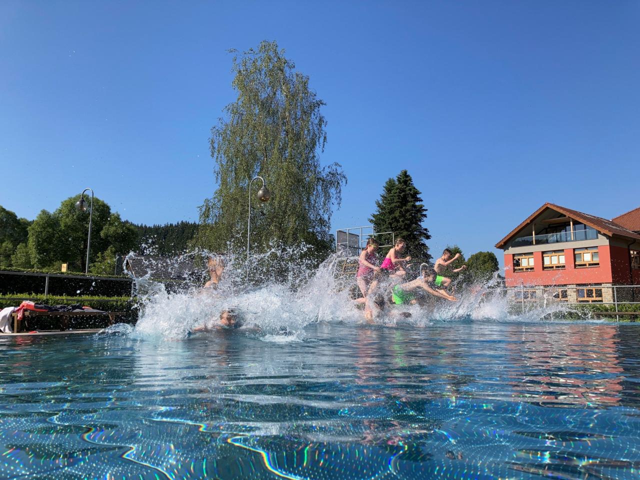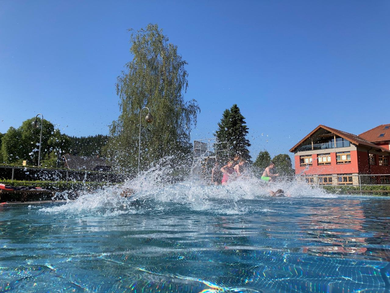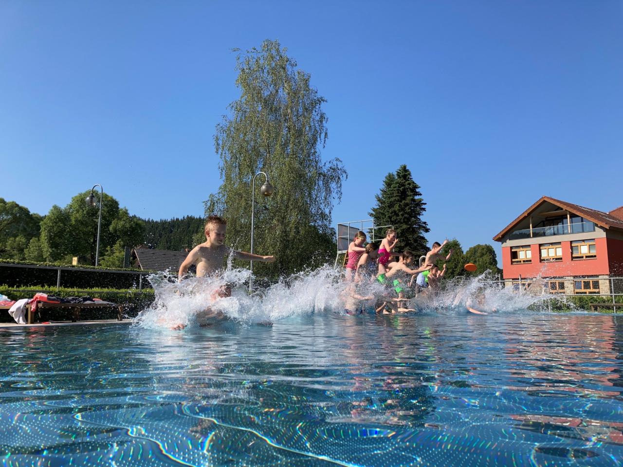 Hodina tělesné výchovy žáků 4. třídy s paní učitelkou D. Detrikovou na našem krásném koupališti vedle budovy školy. Krásné poslední dny letošního náročného a netradičního školního roku.