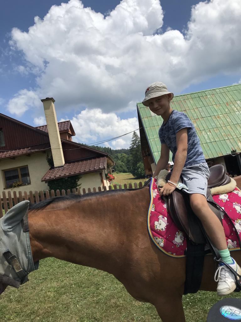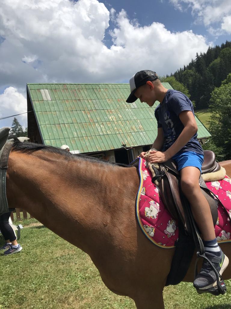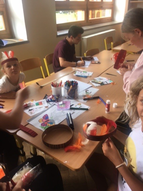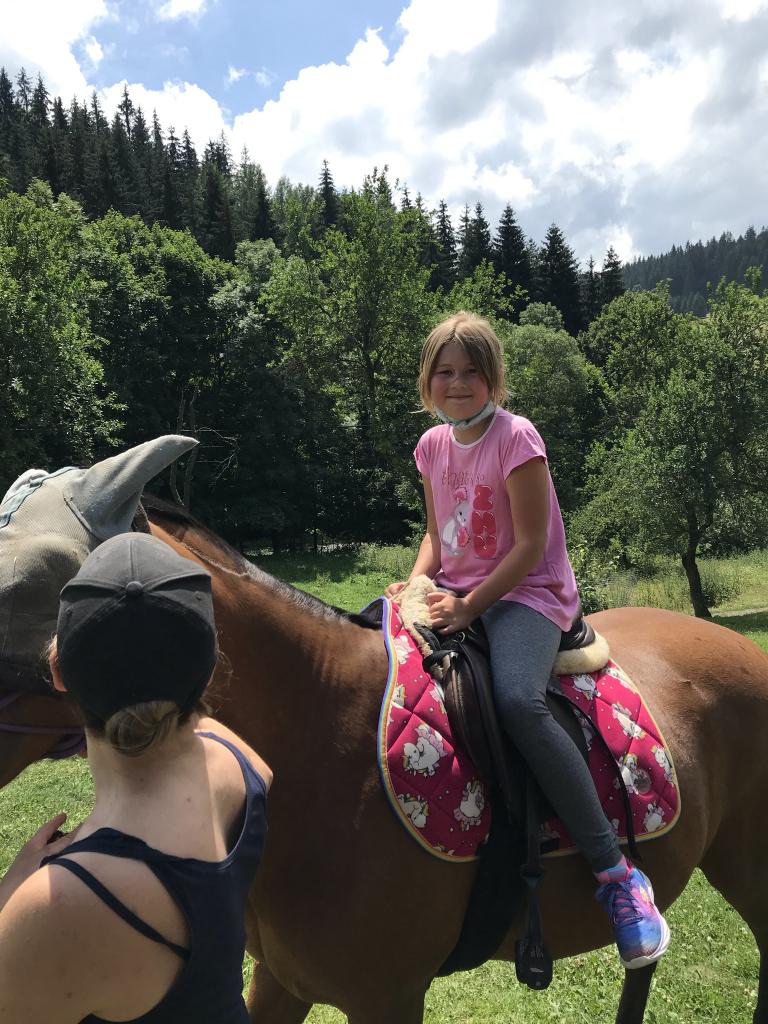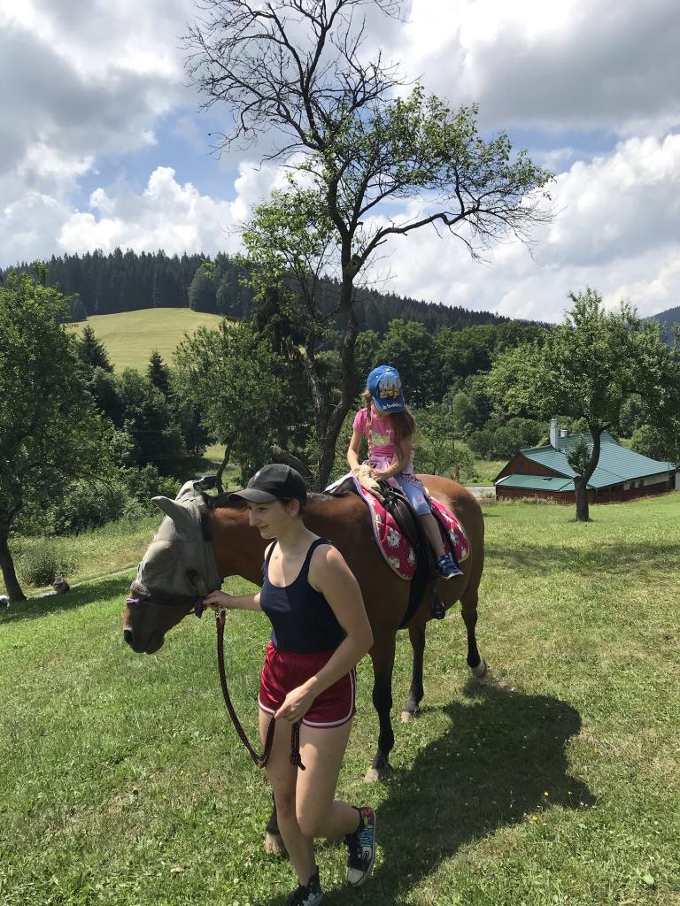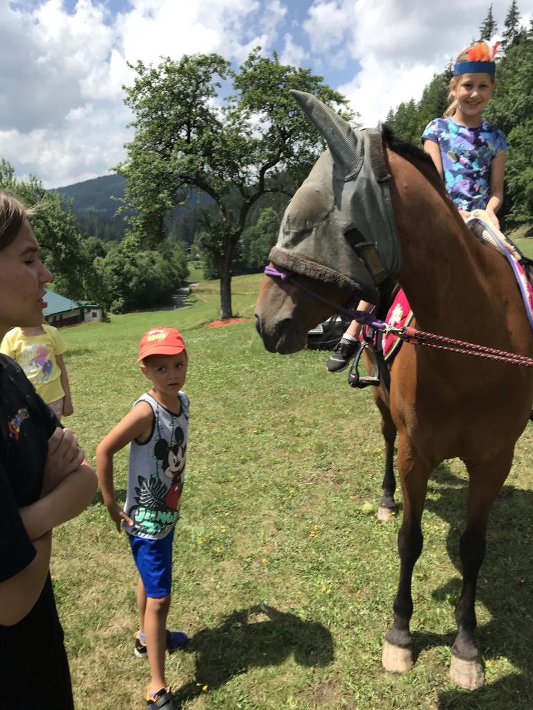 Ranní rozcvička byla zaměřená na aerobik s Milenou Mikulovou. Dopoledne se věnovaly přípravě indiánské čelenky a vymýšlely si své indiánské jméno, protože odpoledne byly jezdit na koních a podívat se na zvířátka u Lenky a Františka Válkových. Moc děkujeme za krásné odpoledne i s ostatními zvířátky.