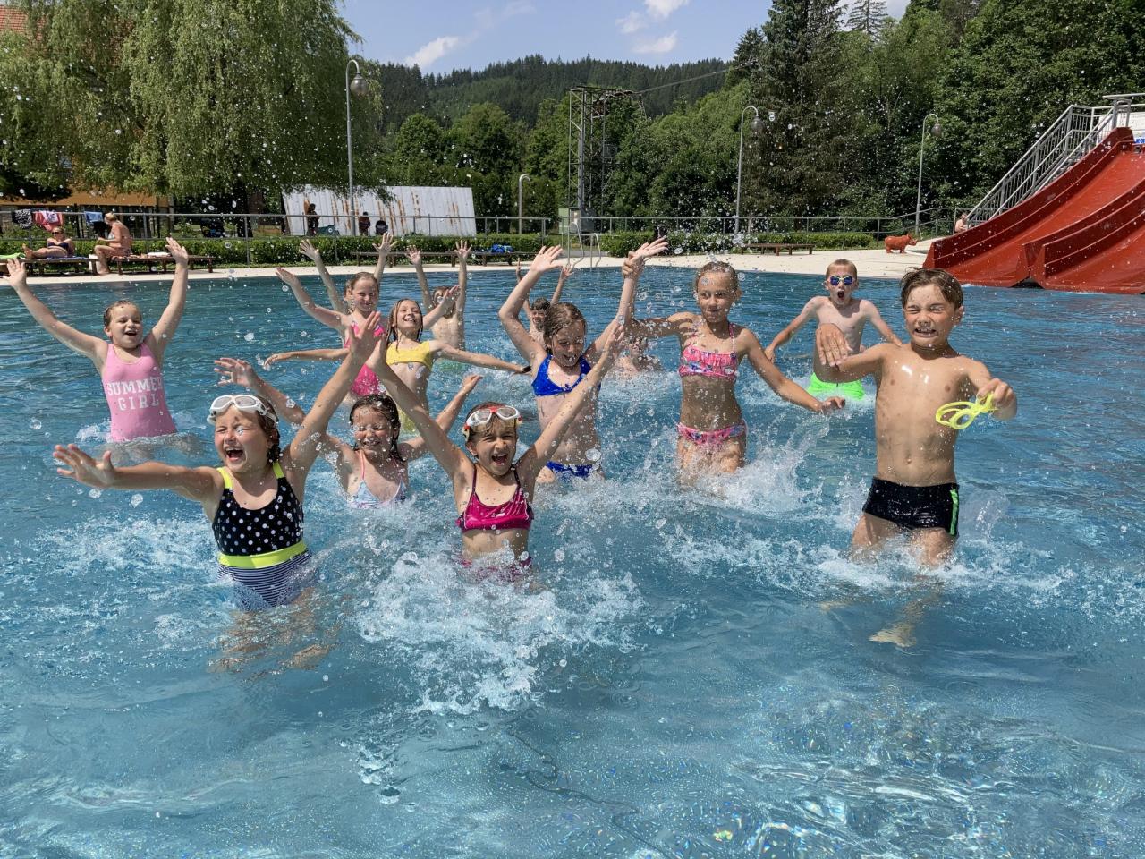 Dnes jsme si užili horký letní den v rámci tělesné výchovy na koupališti.