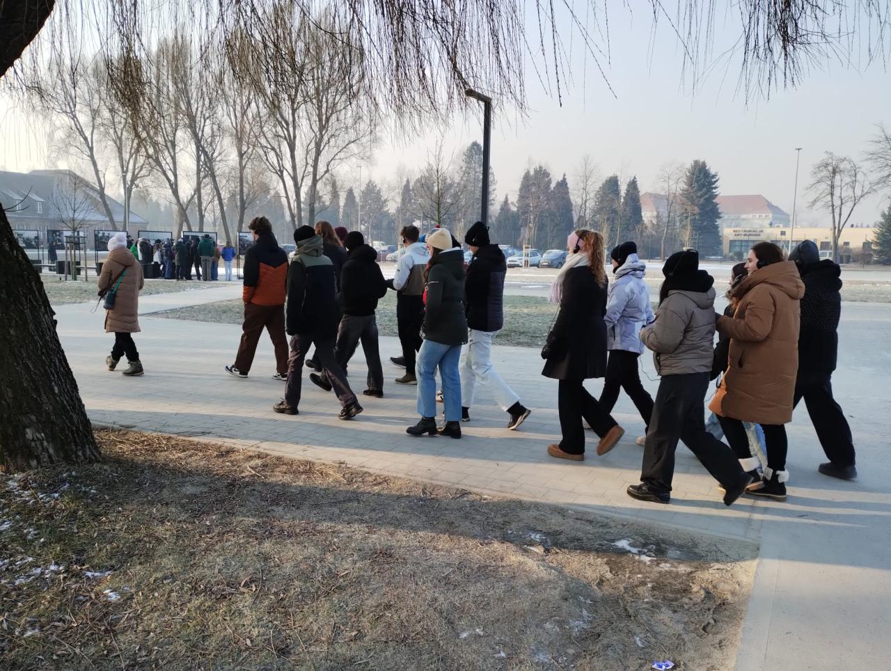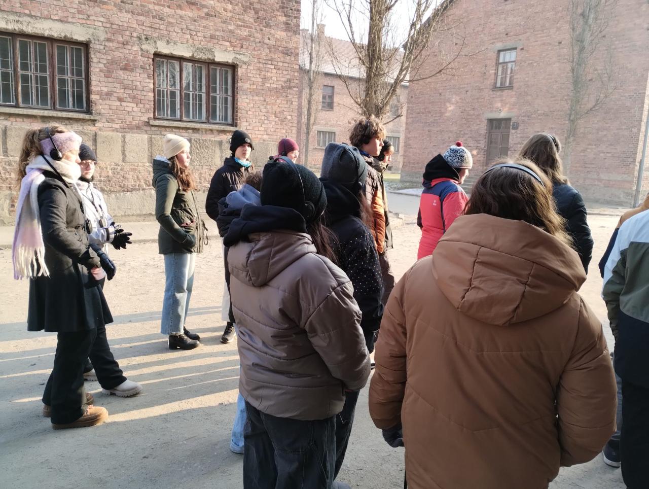 Potom už cesta ubíhala rychle. Před osmou hodinou jsme vystoupili v Osvětimi a šli se postavit do fronty před vstupem do památníku. Bylo pod nulou, ale počítali jsme s tím a byli jsme dobře oblečení. Fronta postupovala rychle, takže jsme se brzy dostali před vstupní kontrolu, která probíhala podobně jako na letišti. Naštěstí při průchodu bezpečnostními rámy nikdo nepípal, takže jsme se plynule přesunuli do místnosti, kde nám pan Kočí představil naši průvodkyni Agnieszku, která je jednou ze 200 osvětimských průvodců.